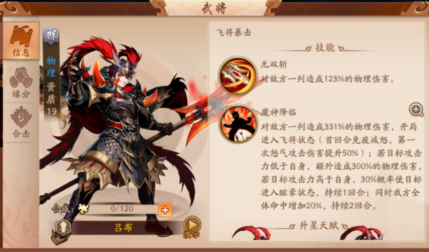 吕布作为主输出需优先培养,其技能无双乱舞和方天画戟可对敌方全体造成高额伤害,配合貂蝉的闭月羞花触发合击技,进一步强化输出与控制效果。貂蝉的倾国倾城技能可降低敌方攻击力,为团队提供生存空间。左慈的幽冥鬼蜮和幻术大师技能则用于打乱敌方阵型,华佗的青囊经保障续航,张角或袁绍根据需求补充输出或光环增益。