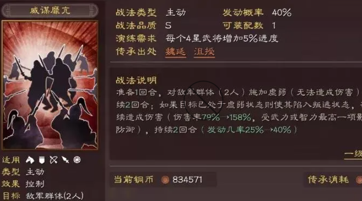 战法搭配需围绕治疗与减伤双核心展开。首选御敌屏障在前四回合提供稳定减伤,与自带战法形成双重防护。暂避其锋能有效保护主C武将,而刮骨疗毒可补充单体急救能力。若追求功能全面性,威谋靡亢的虚弱效果能显著降低敌方输出上限。注意避免选择发动条件苛刻的战法,50%概率的胡笳余音已需要足够战法点支撑。