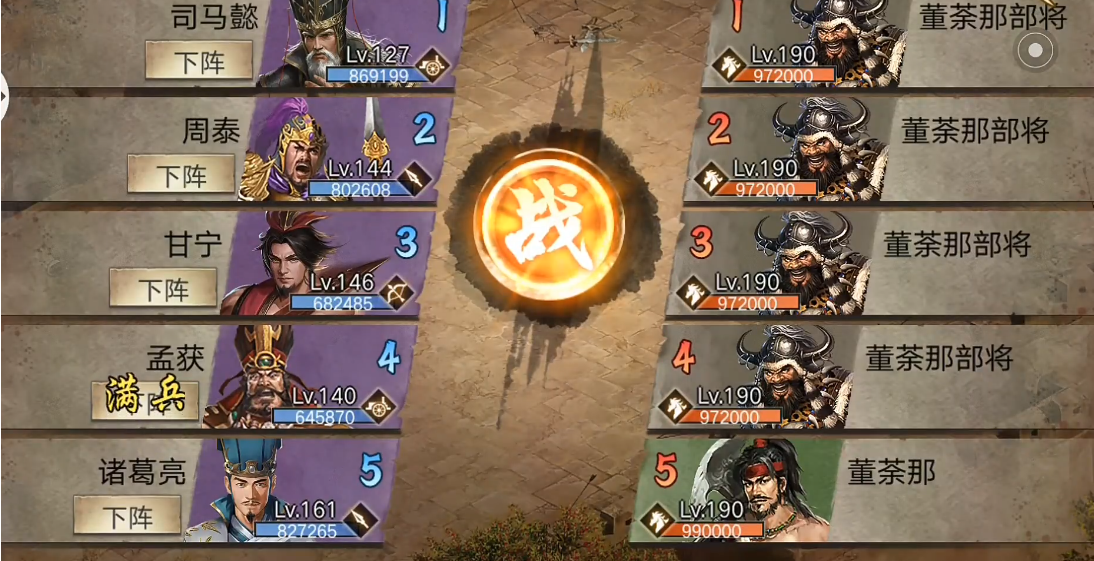 对于配置稍低的玩家,可以尝试另一种排将方案:裸装貂蝉带司马懿副将,主要依靠司马懿反弹第二个NPC战法;第二个位置用驱虎关羽;第三个上灵龟夏侯惇带副将;第四个用烛龙周瑜,关键是要在最后1-2排时释放战法;最后依然是凤凰甘宁带曹仁。