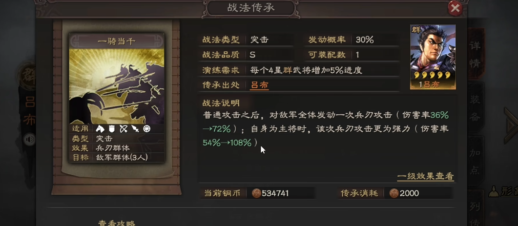 吕布最适合携带突击类战法,比如一骑当千鬼神霆威暴戾无仁等,这些战法能在决斗中多次触发,大幅提升输出。如果资源有限,也可以选择A级战法如手起刀落或百骑劫营,虽然效果稍逊,但依然能提供不错的伤害。兵种方面优先选择骑兵或弓兵,利用S级适性增强战斗力。