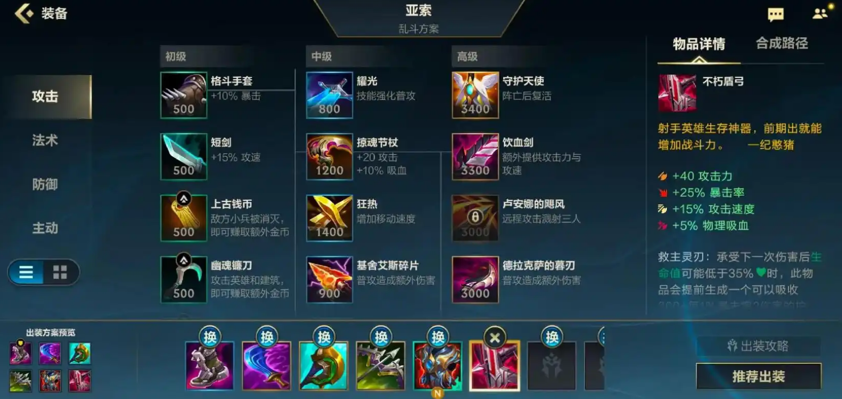中期需根据局势补充续航与防御装备。破败王者之刃是第三件的优选,其被动百分比伤害能有效应对坦克英雄,同时吸血效果增强持续作战能力。若敌方控制较多,可提前合成水银饰带或升级为水银弯刀;若物理输出压力大,则选择死亡之舞或斯特拉克的挑战护手(血手),两者均能提供攻击力与抗爆发属性。