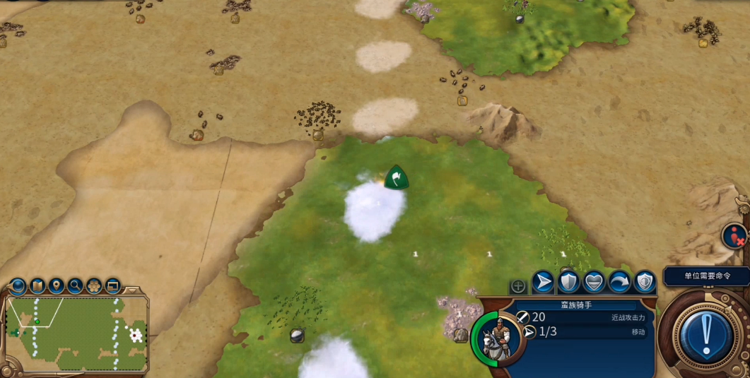 野蛮人的侦察兵头上出现感叹号时,说明它已经发现咱们的城市,必须立刻拦截。一旦它回到营地,野蛮人就会疯狂爆兵,生产力比咱们高得多,根本挡不住。所以早期勇士的走位很重要,绕着城市巡逻,发现侦察兵就逼退它。如果有多余的兵,可以设置警戒模式,看到侦察兵直接堵截。没钱没兵的话,赶紧造兵准备防御,不然等野蛮人大军压境就晚了。