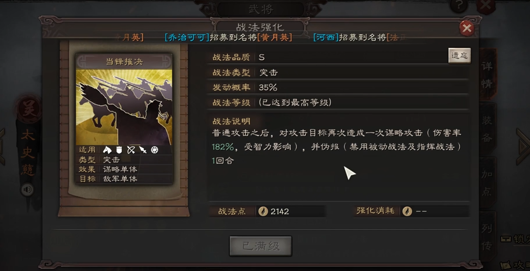 当锋摧决速度调整是关键,尽量让朱儁快过对手的减伤武将,比如程普或周泰,这样他的伤害不会被削弱。如果对手有伪报或当锋摧决,要注意避开他们的先攻回合。兵书推荐虚实系的攻其不备和将威,进一步放大朱儁的爆发潜力。