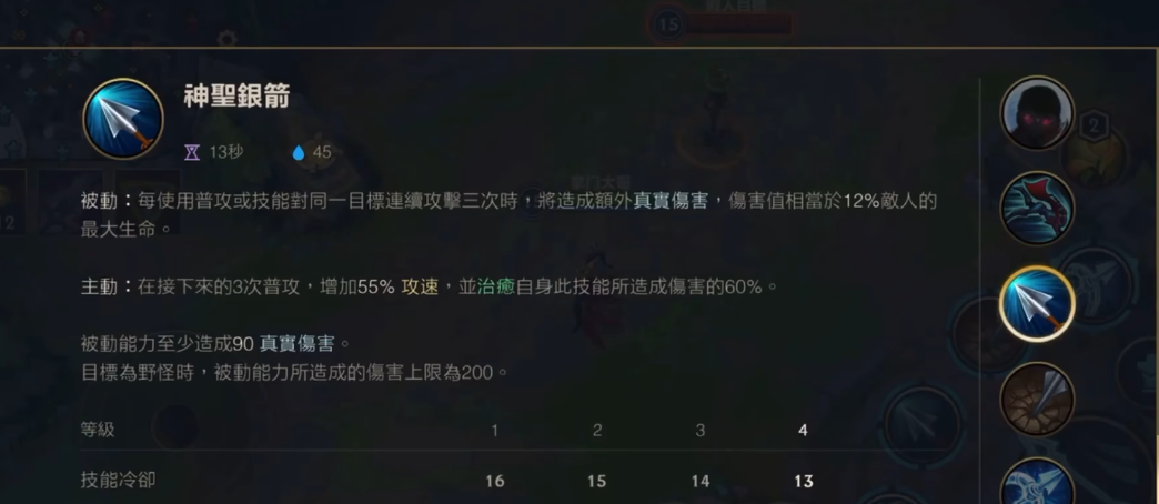 主升顺序通常为2技能神圣银箭优先,1技能副升。W技能提供的百分比真实伤害是薇恩中后期输出的核心保障,但一级时其被动三环的触发效率较低,且主动攻速加成需要消耗法力值。相比之下,Q技能的基础伤害和功能性在前期更为实用。需若选择上单位置,一级学E技能重型弩箭偶尔可作为特殊对策,利用击退效果防止敌方近战英雄抢线,但这种加点会显著降低补刀和换血能力。