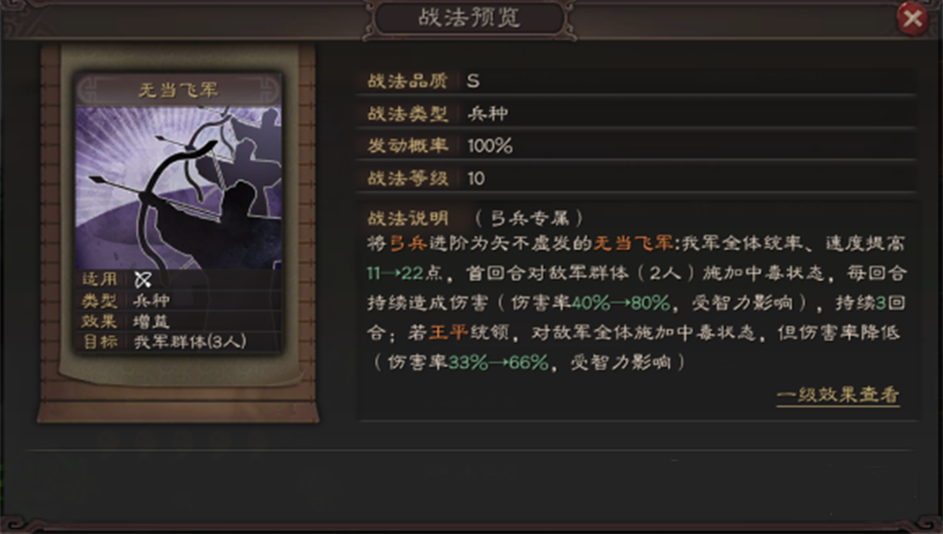 弓兵体系中的无当飞军和锦帆军各有侧重,无当飞军提供稳定的谋略伤害和中毒效果,锦帆军则强化普攻并附带掠夺机制。弓兵对枪兵有天然克制优势,但需注意避开盾兵阵容。枪兵系的青州兵和白毦兵分别擅长反击和谋略输出,前者能在受击时回复兵力,后者可将普攻转化为谋略伤害,适合搭配关羽、赵云等武将。特殊兵种的实际强度还与武将适性相关,S适性可发挥120%属性,A适性则为100%,因此选择与主将适性匹配的兵种至关重要。