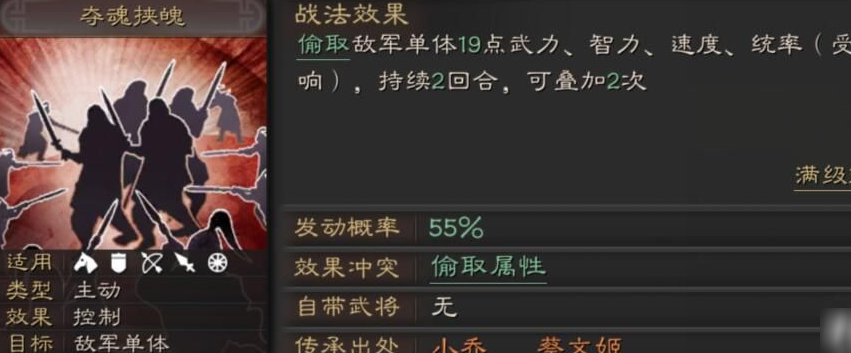 战法选择上优先考虑瞬发高概率主动技能,夺魂挟魄和刮骨疗毒是主流组合。夺魂挟魄能偷取敌方属性强化自身,刮骨疗毒提供续航保障。若追求极限输出,可将刮骨疗毒替换为风助火势或形机军略,但需注意兵力损耗风险。兵书推荐虚实系的顺应天时和妙算,提升战法发动率与谋略伤害。属性加点全智力,必要时调整少量速度确保先手。