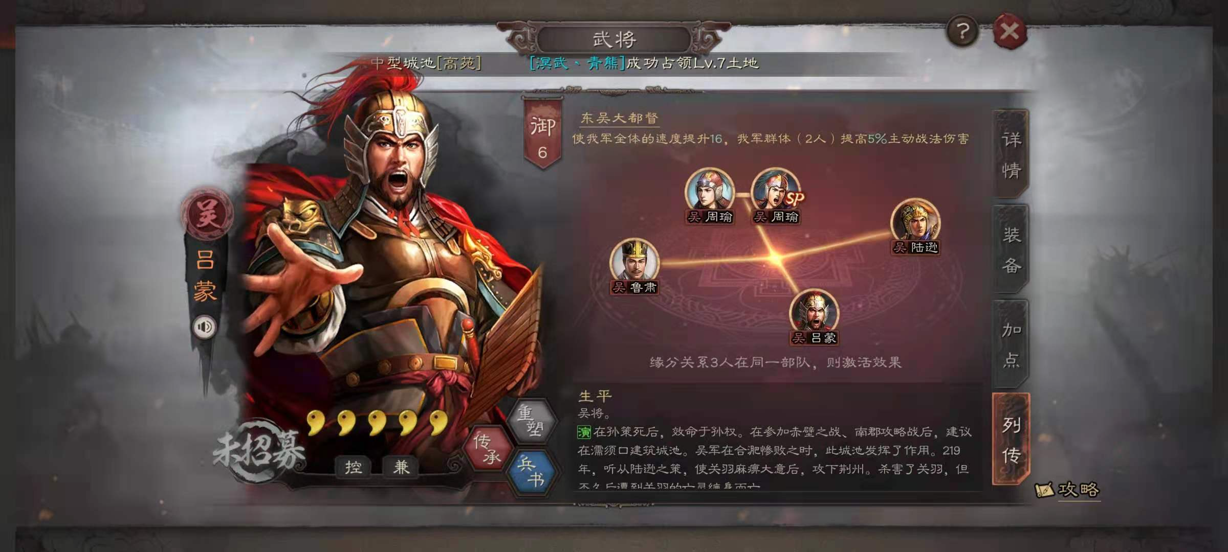 陆逊作为吴国核心谋略输出武将,战法搭配的核心思路是围绕灼烧状态展开。自带战法火烧连营拥有高发动概率和爆发伤害,若目标已存在灼烧状态,可对敌军全体造成谋略伤害并传递灼烧效果。因此优先选择能提供灼烧状态的战法,如传承战法熯天炽地或通用战法天降火雨,确保陆逊快速进入爆发期。