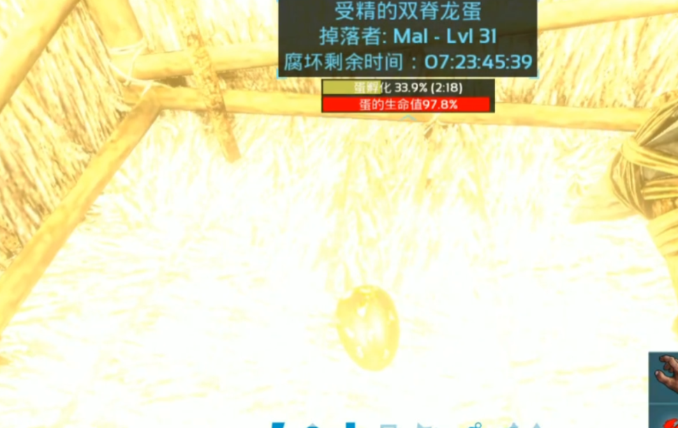 准备工作完成后,将双脊龙蛋丢弃到篝火附近的地面上,通过点击游戏中的DROP选项实现。丢弃后,蛋上方会显示一个金色进度条,代表孵化倒计时。玩家需密切观察蛋的状态提示,如果环境温度不合适,系统会给出太冷或太热的警告,这时应及时调整篝火数量或位置。太冷时增加篝火,太热时熄灭部分篝火,以保持蛋在理想温度范围内。这个过程要求玩家持续监控,避免蛋的生命条耗尽导致孵化失败。