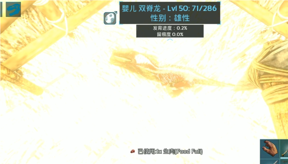 孵化过程中,金色进度条结束后,双脊龙幼崽会破壳而出玩家必须立即点击认领按钮,否则幼崽可能逃跑或被攻击。认领后,幼崽进入驯养阶段,需要持续喂养肉类食物,因为双脊龙是食肉恐龙。喂养频率较高,基本每三小时左右补充一次食物到幼崽背包,并留意游戏提示进行跟随或互动,确保其健康生长。保持幼崽在安全区域,避免其进入巡逻状态,以防意外丢失。