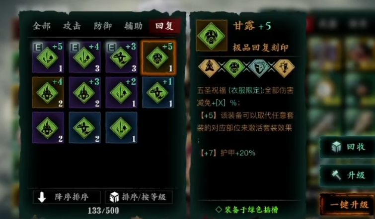 五圣祝福是中一种特殊的刻印组合效果,由强命、甘露、震荡、佛体四种刻印构成。当这些刻印全部强化至+5后,装备该刻印组合的衣服可以替代任意套装的对应部位来激活套装效果。这一机制极大丰富了装备搭配的灵活性,是游戏后期提升战力的关键要素之一。