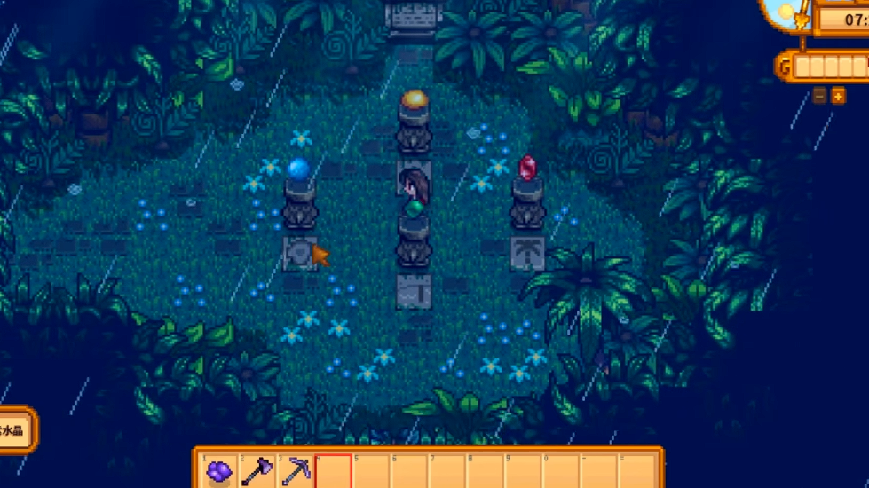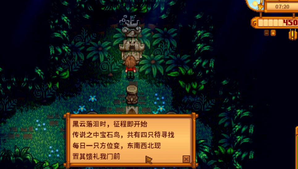 若想加快解谜进度,可以使用降雨图腾改变天气。需要注意的是姜岛与鹈鹕镇的天气系统相互独立,在姜岛使用降雨图腾不会影响主城镇的天气状况。解谜完成后宝石鸟仍会继续出现,但不再具有解谜功能,其掉落的宝石可作为普通材料使用。