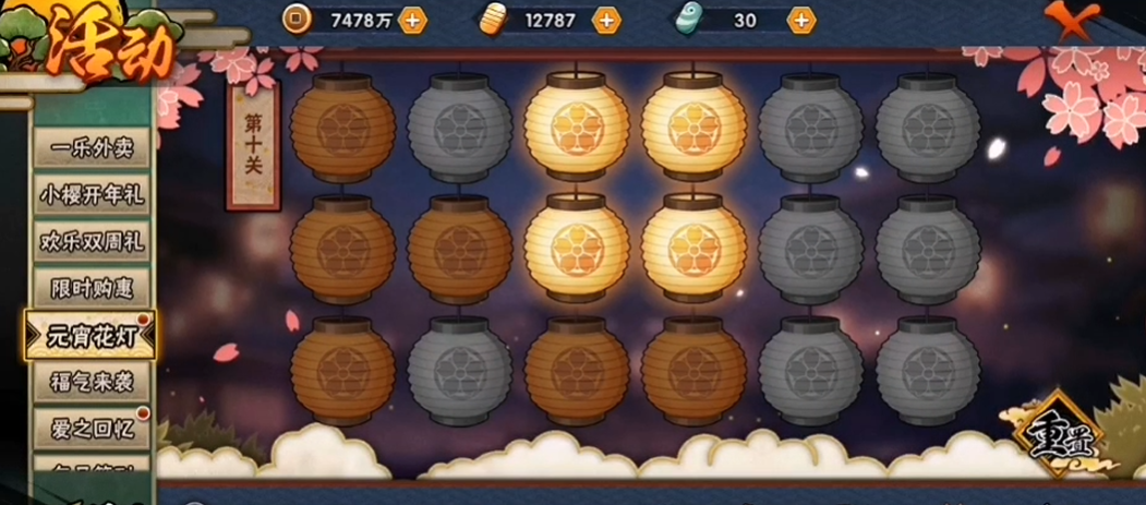 关键通关顺序是依次点击花灯1、花灯2、花灯3、花灯4、花灯5。这关需要特别注意点击顺序不能错,否则需要重新开始。第十关的难点在于花灯之间的联动效果,点击任意花灯都会改变它和周围花灯的明暗状态,所以必须严格按照攻略顺序操作。