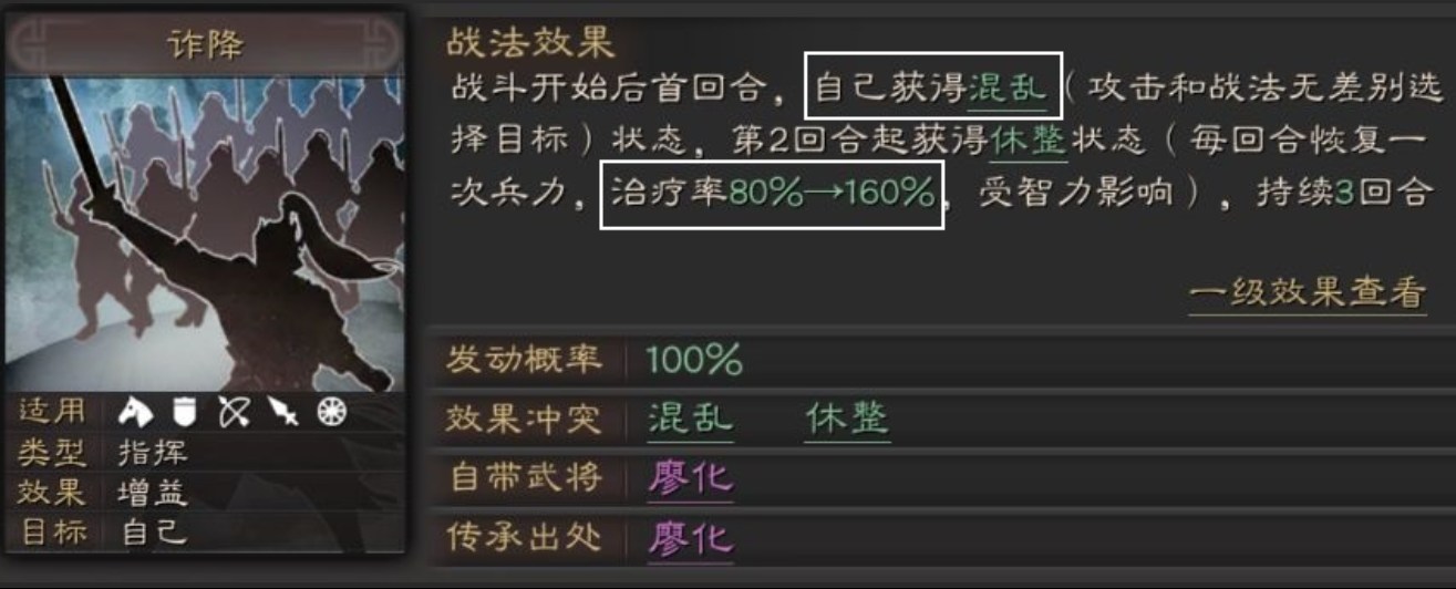 周泰作为的核心辅助武将,其自带战法肉身铁壁能为队友承担伤害并提供增伤效果,是吴国物理输出队伍的重要拼图。诈降作为A级战法,由廖化传承获得,效果为第一回合自身混乱,随后三回合获得高额休整状态回复兵力。将诈降战法配置给周泰时,需要充分考虑其战术定位与队伍整体配合。
