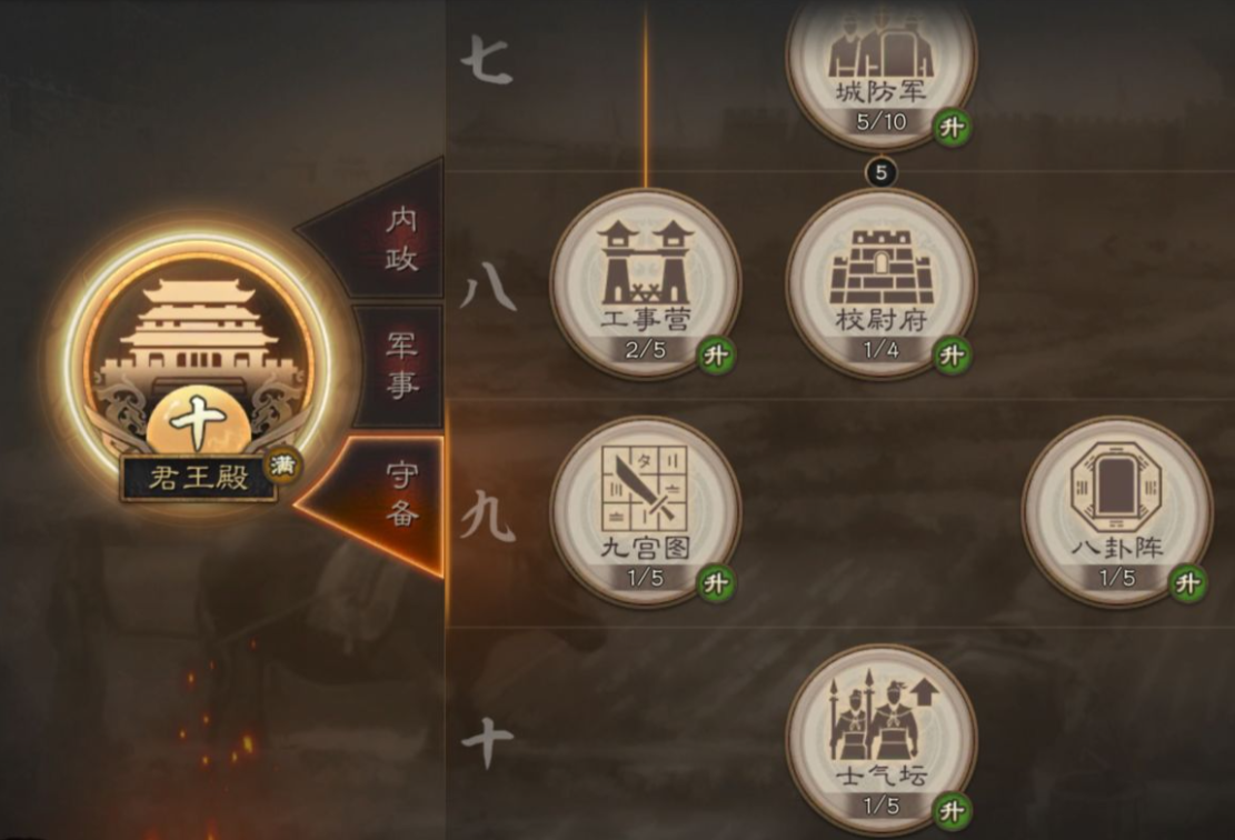 正规军玩家应优先提升城墙、城防军和校尉府的等级,这些守备设施能显著增强城池防御能力。城墙5级可解锁城防兵,有效防止侠客军使用1兵拆迁战术。满级城墙4000耐久度需要主力队伍反复攻击才能攻破,这为防守争取了宝贵时间。九宫八卦和校尉府的加成也不容忽视,它们能在守城战中提供关键属性提升。资源即将被掠夺时,及时消耗资源升级建筑或向同盟捐献,让侠客军无功而返。