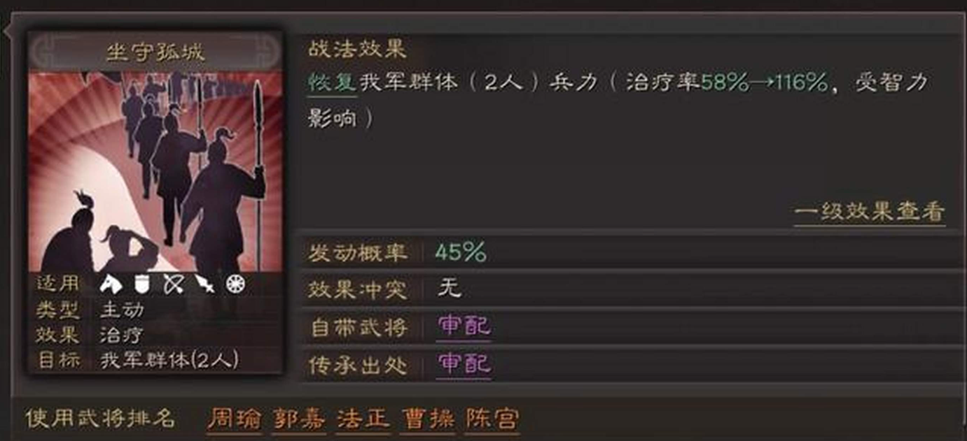 除了直接抽卡,审配的战法坐守孤城也可以通过传承获得。如果已经抽到多余的审配,可以考虑分解他来获取这个战法,然后给其他智力型武将使用,比如周瑜、诸葛亮这类高智力角色,治疗效果会更强。审配本身作为辅助武将也有不错的实战价值,尤其是前期资源紧张时,他的低培养成本和高性价比能让咱们更快度过开荒阶段。