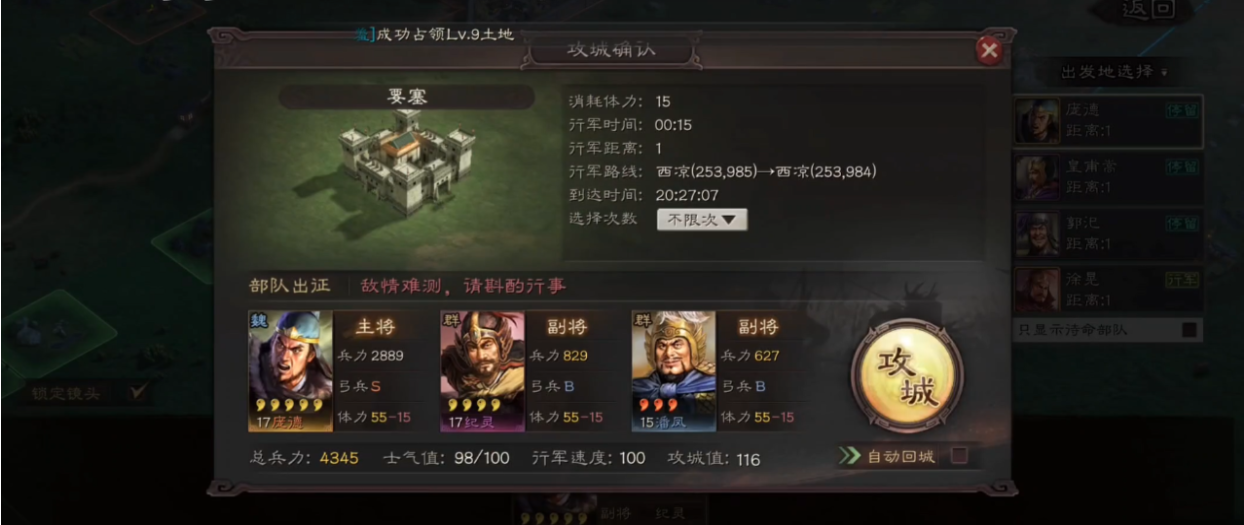 要塞虽然占用一个领地名额,但不会影响咱们对其他资源地的占领。它的视野范围比普通建筑更广,能提供两格视野,方便咱们提前发现敌人的动向。需要塞的耐久度归零后才能被完全占领,所以攻打时最好准备一支主力部队消灭守军,再搭配器械兵快速拆耐久。如果只是单纯用普通队伍硬拆,效率会很低且容易被人偷袭。