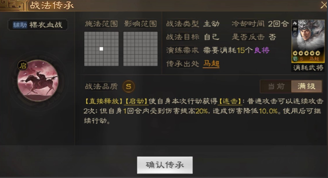 最适合马超开荒的主动战法是强攻或者裸衣血战,前者能提供连击机会,后者S2虽然还不能用,但思路是类似的,就是让马超一回合能多打几下普攻,从而频繁触发群攻效果。你要千万别给他带那些需要准备一回合的华丽战法,比如所向披靡,开荒抢的就是时间,战法点也金贵,带这种慢速战法会严重拖累你的节奏。搭配一个稳定的副将,比如带盛气凌敌的工具人,能有效保护马超,让他站得更稳。