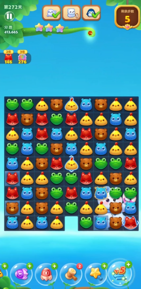 金豆荚的收集需要确保左侧的通道时刻保持畅通,避免银币或雪块再次堆积。藤条会移动步数向下蔓延并困住动物,这会阻碍金豆荚的下落,因此需要及时合成特效来打破这种困境。面对藤条障碍时,玩家需要灵活应对,不要提前消除毒液或其他蔓延物,以免减少后续的消除机会。当毒液蔓延到一定数量时,可以利用合成好的特效进行交换,这样能快速清除大片区域。