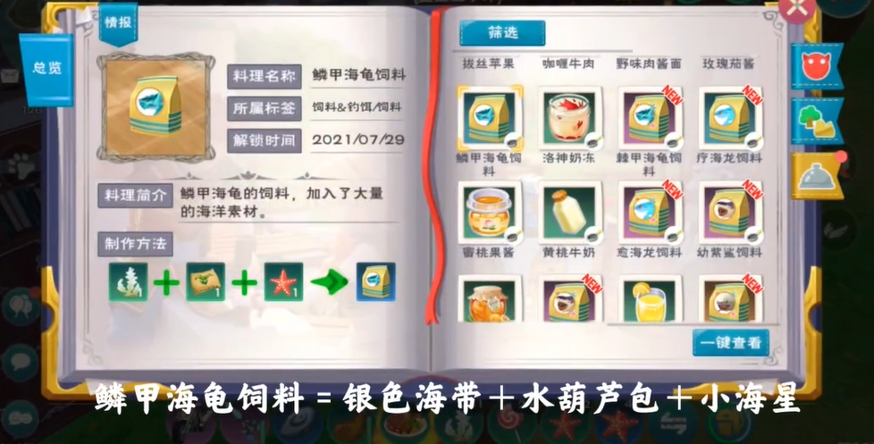 鳞甲海龟饲料的配方其实不算特别复杂,核心就是三样东西:银色海带、水芦果饲料包,还有小海星。把这三种材料按照正确的比例放进烹饪锅里,点击制作,就能合成出鳞甲海龟饲料了。这个配方是固定的,可别自己随便换材料,不然做出来的可能就是别的东西了。准备好了饲料,你才算是拿到了和这只海龟交朋友的敲门砖。