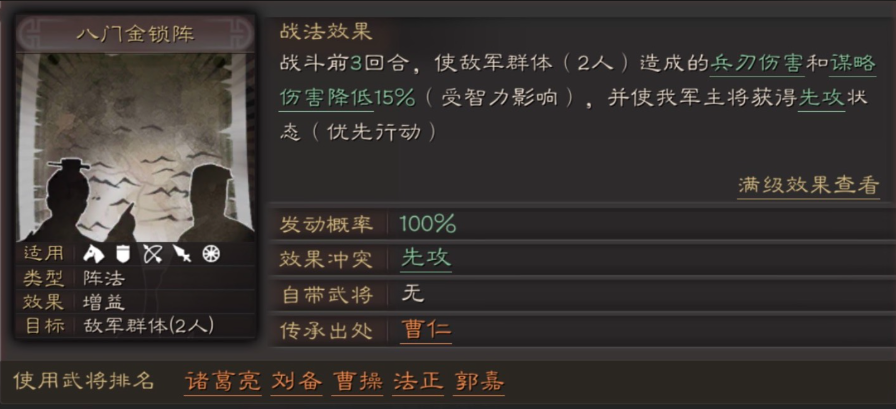 工具人承担了许多关键但无需高属性支撑的辅助功能。他们可以携带诸如盛气凌敌、御敌屏障、八门金锁阵等战法,这些战法的效果取决于技能本身,与携带者的属性关系不大。让主力武将去装备那些依赖自身武力或智力加成的输出、治疗战法,而将这类功能性战法交由工具人负责,实现了战法资源的优化分配。这样不仅能充分发挥核心武将的潜力,也确保了队伍控制、减伤等辅助手段的完备,在面对不同守军阵容时拥有更强的适应性和稳定性。