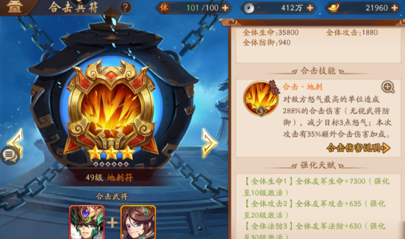 神兵和兵符的搭配对魏国阵容也至关重要,例如寒冰裂符作为魏国招牌合击技能,能对十字范围敌人造成伤害并概率触发眩晕,配合夏侯兄弟能打出连环控制。地刺符和憾天符适合前期使用,分别针对怒气最高敌人和残血目标。在兵符系统中,即便武将阵亡仍可触发技能,合理利用这点能在残局阶段扭转战局。