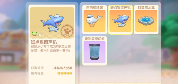 成功把斑点鲨钓上来之后,这事儿还没完,你得知道拿它去干嘛。斑点鲨最主要的用途就是去找一个叫大力的NPC兑换专属家具。大力的位置在爱心广场,警察局或者摩尔报社旁边,你找到他后互动,选择神秘商店功能。在里面就可以用你钓到的斑点鲨兑换一个叫斑点鲨留声机的家具。这个留声机是纯装饰用的,可以摆放在你的家园里,能提升一点家园的装饰评分,看起来也挺特别的。钓上来的斑点鲨本身好像不能直接卖掉或者送给别人,所以通常换一个留声机就够了,除非你有特别的收集癖好。换完家具,这条鱼的使命也就完成啦。