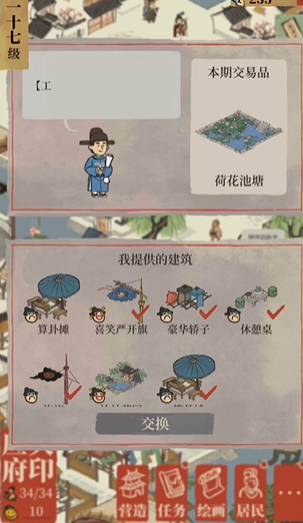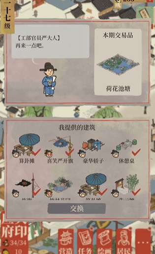 要获得荷花池塘,玩家必须找到严大人进行建筑交换。严大人会不定期出现提供稀有物品的兑换选项。交换基于积分制,玩家需使用现有建筑来积累积分,才能换得荷花池塘。这一过程要求玩家提前准备合适的建筑,并留意严大人的出现时机,通常与玩家等级相关,建议在解锁十级后主动寻找机会。
