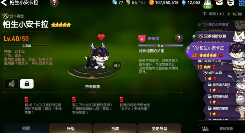 这里要区分一下宠物类型,大厅类型的宠物虽然不能直接增加后记掉落,但它们拥有的装备强化成功率增加或强化经验增加等技能,能为你节省大量强化装备所需的金币和材料,从长远看对整体养成有巨大帮助。频繁更换大厅宠物会重置每日领取礼物的冷却时间,所以建议确定一只主要的大厅宠物后就锁定它,长期培养。而刷后记,你只需要专注于准备好你的战斗宠物就行。