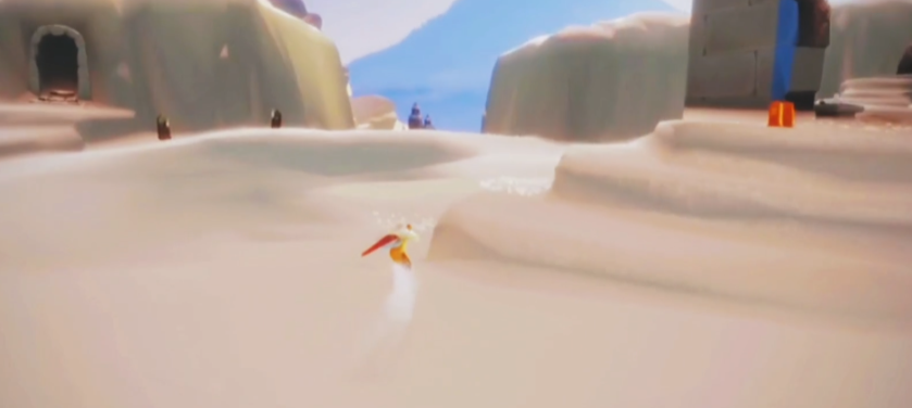 你走到滑行赛道的那个大门前,先别急着进去比赛。就在这个大门口的附近,仔细看看右手边的地形。那里应该有一些岩石和雪的边缘,你需要找到一处看起来像是悬崖边、下面有缺口的地方。找到之后,就控制你的角色小心翼翼地挪到那个边缘,然后朝着缺口外面跳下去。跳下去之后你并不是要掉到谷底,而是立刻拉动方向键,让人物垂直地向上飞行。