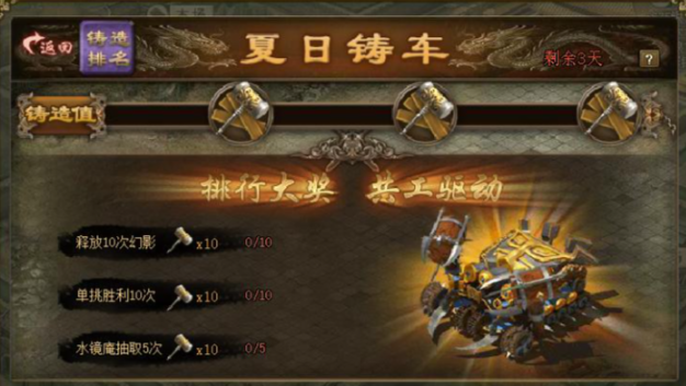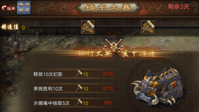 铸车大赛的奖励系统非常丰富,主要分为大节点奖励、小节点奖励和排名奖励三大类。大节点奖励要求铸车次数累计达到75次、150次和300次,每个阶段都有对应的专属道具奖励。小节点奖励则是在烈焰战车线路达到40、80、120次时发放战车改造券,而盾甲战车线路同样进度则奖励陨铁,每次铸车会同时为大进度条和小进度条增加计数,这样你就能同步推进多个奖励目标。此外排行榜奖励只针对铸车次数排名前三的玩家开放,但前提是必须连续三天都完成大进度的满额要求,并且每天排名都稳定在前五名内,这样才能在活动收官后通过邮件额外拿到第二战车驱动铁甲蛮牛这样的珍贵物品。