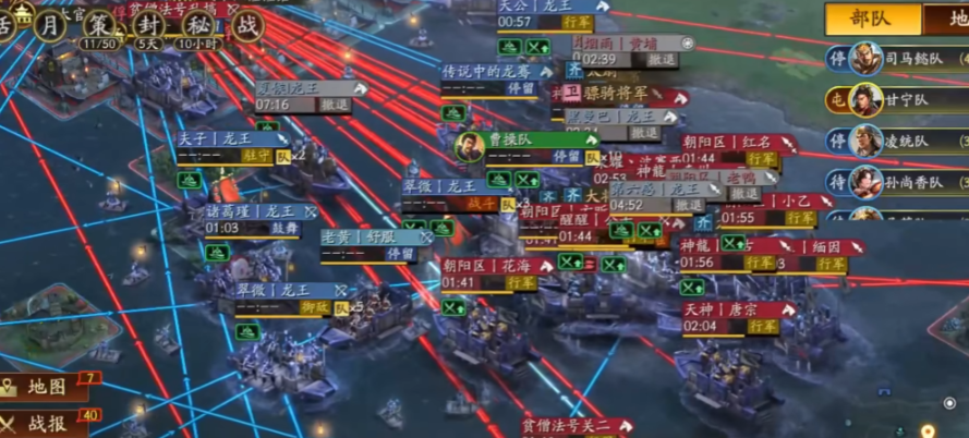 具体操作起来,有几个细节要特别注意。第一是垫刀队伍的选择,盟友派出的队伍不能太强,如果直接一波把守军全打掉了,那这块地就归他了,你就没法占。所以最好让他派一支兵力适中、带点控制技能的队伍,大概能消耗掉守军百分之六七十的兵就行,把守军打成残血状态。第二是沟通和时机,你和盟友得在游戏里说好,他打完你马上就得跟上,因为守军被打平或者消耗后,会有几分钟的恢复时间,你得在这个窗口期内把补刀队伍派出去,错过了守军兵力一回,可能又得重来。第三是地块选择,尽量挑离盟友主城或者要塞近的地,这样他行军士气高,垫刀效果才好,如果太远,他队伍走到那士气掉光了,也打不出伤害。