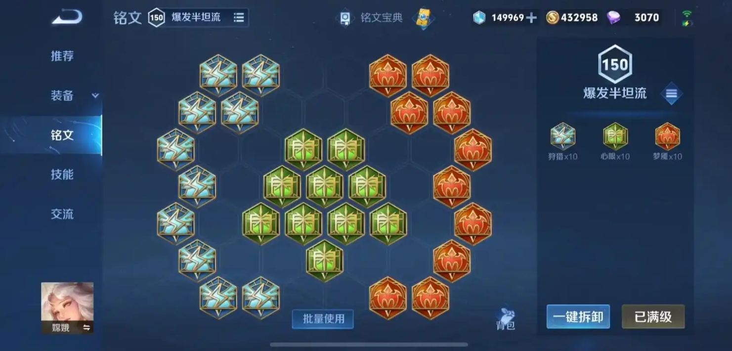 如果你觉得前期对线压力比较大,希望更抗压一点,也可以把蓝色的5个贪婪换成5个调和,这样能增加一些最大生命值和每5秒的回血,让你对线期更稳。因为嫦娥的被动会将部分法术攻击转化为法力值,所以铭文里法术攻击的收益相对没那么高,法术穿透和吸血的优先级要更高一些。