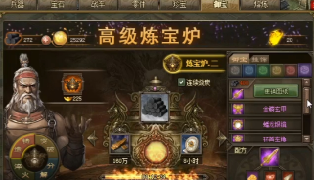使用炼宝炉铸造宝物时,玩家需要先进入宝炉界面,选择要制作的宝物图纸,图纸是铸造界面直接显示的未完成物品,无需额外寻找。材料分为木炭和专属材料两部分,木炭通过消耗木材烧制获得,比如160万木材烧80木炭需8小时,20万木材烧10木炭需1小时。添加图纸后,商店才会刷新出对应的专属材料,比如踏云履需要蚕丝,50个蚕丝价值500万银币。填满所有材料槽后,点击开始铸造,过程通常需要时间,例如白色御宝青铜剑的锻造耗时约30分钟,完成后宝物可装备给武将,提升行军速度或战斗属性。铸造过程中,玩家可以使用冷却水加速锻造,节省等待时间,这对于快速获取高级御宝很有帮助。