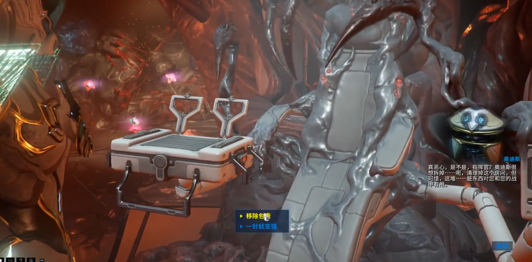 被感染的房间通常指的是你飞船轨道飞行器下层那扇被生物组织缠绕的门后的空间,即Helminth感染室。这个房间是专门用于处理战甲因接触感染体而生成的寄生囊肿,也就是你脖子上长出的那个粉嫩瘤子。只有当你的战甲已经感染了完全成熟的Helminth病毒,或者你拥有Nidus战甲时,才能进入这个房间进行相关操作。进入房间后,你会看到内部被Infestation组织覆盖,中央有一把诊疗椅,这就是进行清理操作的核心交互点。