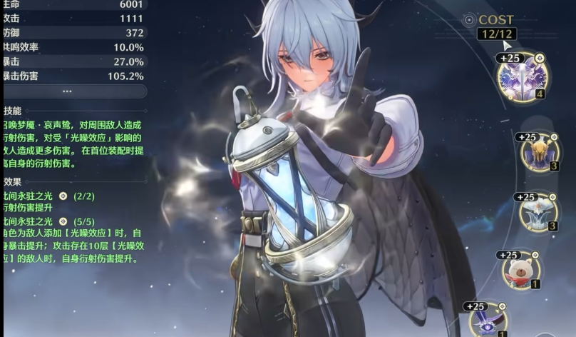 声骸套装首选此间永驻之光五件套,该套装能在角色为敌人附加光噪效应时提升暴击率,并在攻击高层数敌人时进一步提高衍射伤害,完美契合赞妮的输出模式。在过渡期,也可以使用光耀之誓与轻云出月等套装进行2+2搭配。词条选择上,优先保证暴击率与暴击伤害的平衡,其次追求光属性伤害加成、百分比攻击力与适量的共鸣效率。武器方面,她的专属武器焰光裁定能提供攻击力提升并强化光噪效应的伤害,是最优选择;其他如探源逐本或噬渊沦亡等武器也可作为替代。