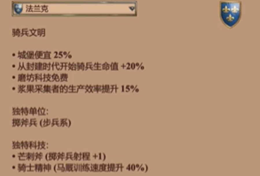 法兰克是骑兵战术爱好者的首选强势文明。其骑士单位拥有额外的生命值加成,在封建时代和城堡时代的骑兵交锋中占有先天优势。免费的农场升级科技为他们节省了大量木材,使得经济能够更专注于支持骑兵的持续生产。这种设计让法兰克非常适合执行经典的骑兵快攻战术,通过早期骑士的不断骚扰和压制来建立优势,并在帝王时代升级为更强大的圣骑士,将骑兵优势保持到后期。