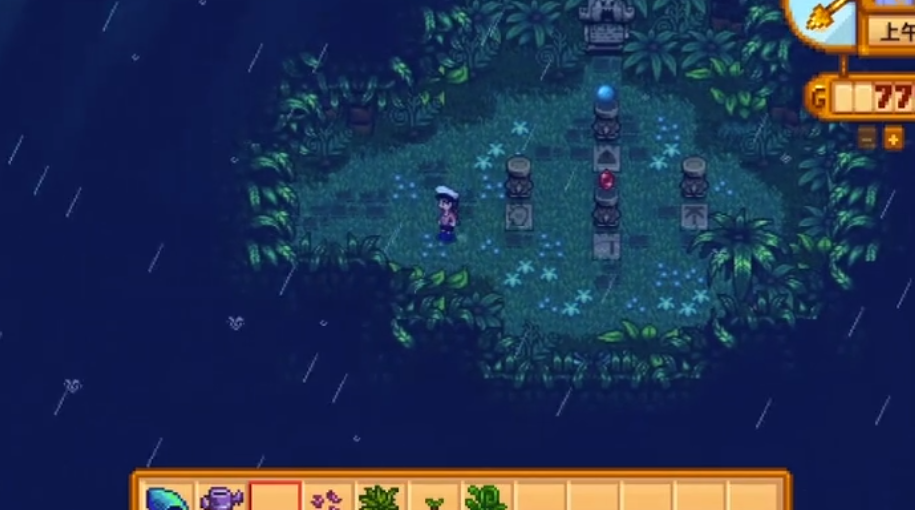 若想主动触发宝石鸟出现,可以使用降雨图腾直接在姜岛上改变天气,但需注意姜岛天气预报的独立性。由于方位与颜色的对应关系随机,玩家可以通过收集两个方位的宝石进行试错排列,无需集齐全部四种颜色也有可能推断出正确组合。任务解谜完成后,宝石鸟仍会在下雨天周期性出现,为玩家提供额外获取宝石的机会,但重复献祭不会再次获得金核桃奖励。