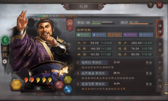 庞统的兵种适应性以弓兵为主,所以阵容搭配上尽量选择弓兵队友,比如黄忠、周瑜、陆逊等。白马义从对庞统的帮助很大,不仅能提供先攻,还能提高主动战法的发动率,让他的连环计更频繁触发。如果没有白马,那就更需要后发先至来弥补速度短板。他的战法增伤效果非常强,所以队友最好选择群攻型武将,这样能最大化连环计的收益。后发先至是通用解,攻其不备适合特定阵容,而鬼谋和将威则根据战法灵活调整。