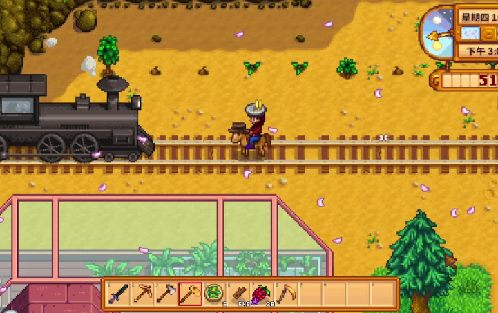 火车是一种特殊的随机事件,玩家可以通过它获取额外资源。火车位于地图北部的铁路区域,具体位置在木匠家左侧的石梯上方。夏季第三天发生地震后,原本堵路的石头会消失,玩家即可前往铁路区域。火车通常在上午9:00至下午6:00之间随机出现,若玩家身处户外,系统会弹出提示一列火车正在通过星露谷。