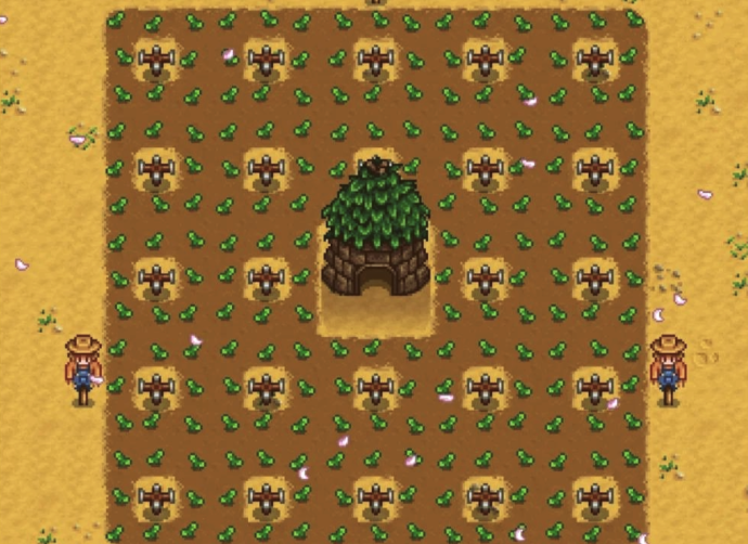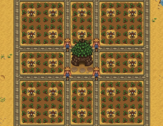 洒水器的使用受到地形限制,需要特别注意安装区域的选择。海滩农场的外围沙地因土质松软无法安装洒水器,只有带有草的区域才能正常放置。建议优先选择农场中部或靠近草地的沙地区域进行开垦,以确保洒水器能够发挥作用。铱制洒水器是海滩农场的最佳选择,其覆盖范围可达24格,能有效减少手动浇水的工作量。