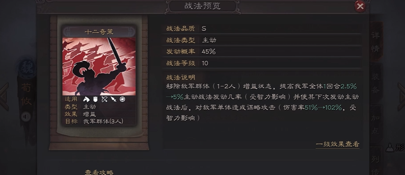 荀攸是一个兼具辅助与输出能力的谋略型武将,其核心价值体现在战法联动性和团队增益上。作为魏国五谋臣之一,他的自带战法十二奇策能够移除敌军增益状态、提升我方主动战法发动概率,并为队友附加额外谋略伤害。从实战角度看,荀攸的强度取决于队伍搭配和战法选择,尤其在以主动战法为核心的阵容中表现突出。