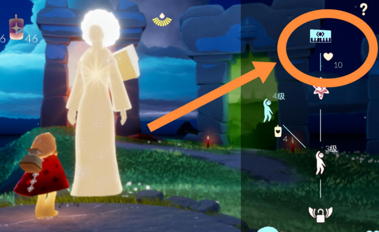 钢琴先祖位于霞谷终点的看台上,其特征是标志性的爆炸头发型。玩家需要通过霞谷的滑行赛道或飞行赛道抵达终点区域,在终点左侧或右侧的看台上即可找到该先祖。点亮先祖需要靠近并长按角色身上的互动按钮,随后跟随先祖的蓝色光点完成回忆收集。完成回忆后,先祖将回归星盘,玩家可在遇境的霞谷星盘中找到该先祖并解锁兑换树。