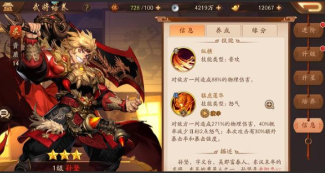吴国单金阵容的核心在于合理利用孙坚、吕蒙、孙权等核心武将的协同效应,搭配小乔和大乔的辅助能力。孙坚作为主力输出,具备横排伤害与概率减怒效果,配合吕蒙的残血收割机制,能在战斗中快速压低敌方血线。孙权则提供稳定的单体控制与攻击增益,确保团队输出环境。小乔通过金将活动获取后,可替换鲁肃提升灼烧伤害与怒气恢复,形成更持久的战斗循环。