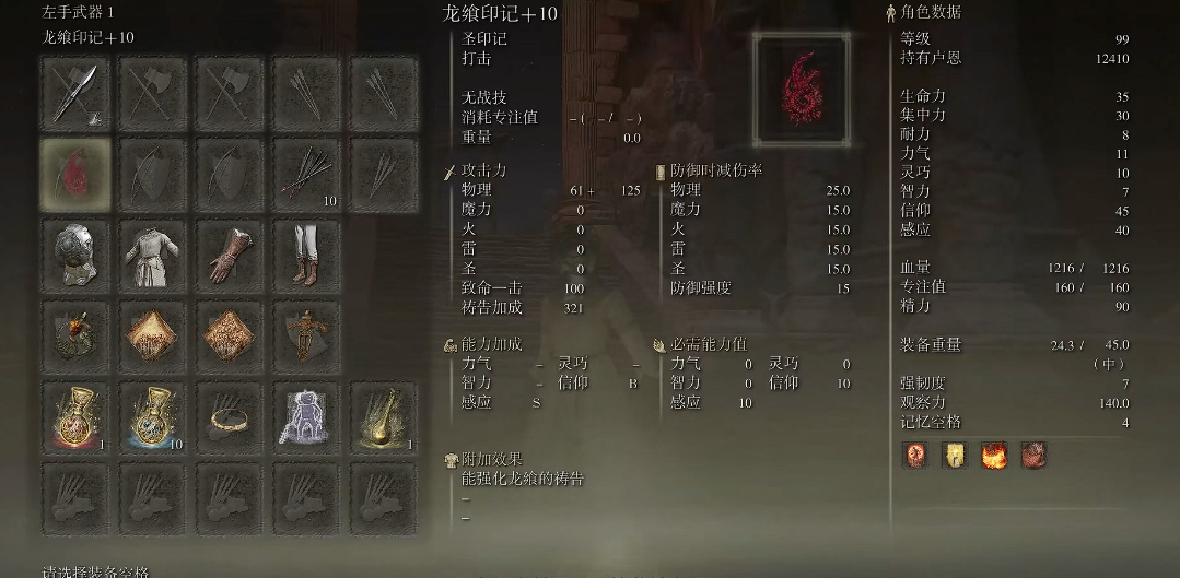 龙息流的核心在于利用龙飨印记强化龙息祷告的伤害,同时通过合理的属性分配提升生存能力。该流派主要依赖信仰与感应属性,前者决定龙息祷告的基础伤害,后者影响异常状态积累速度。建议初始选择预言家或密使职业,两者初始信仰值较高,可减少前期加点压力。武器推荐使用龙飨印记,其特殊加成能显著提升龙息祷告的威力。