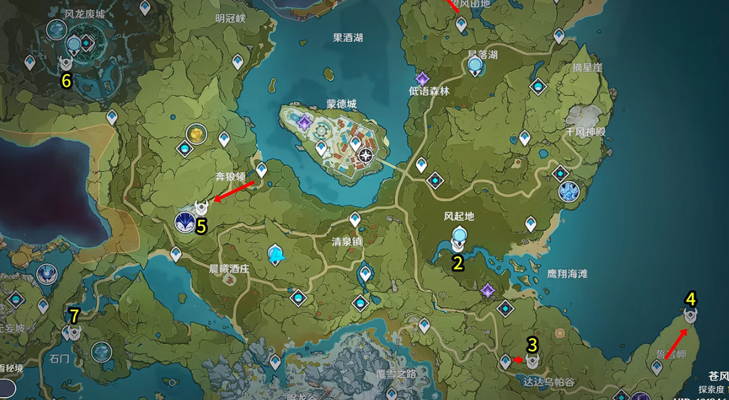 蒙德区域的六个主要刷新点包括风起地七天神像南侧大树下、望风山地东北方向地灵龛旁、誓言岬悬崖边缘、达达乌帕谷高地、风龙废墟西南断桥以及奔狼领环形地形右下方。这些位置通常有明显的地标特征,例如风起地的大伟丘会躺在树下睡觉,风龙废墟的则出现在外延断桥处。探索时建议优先检查这些地标周边区域。