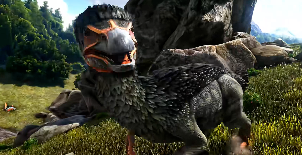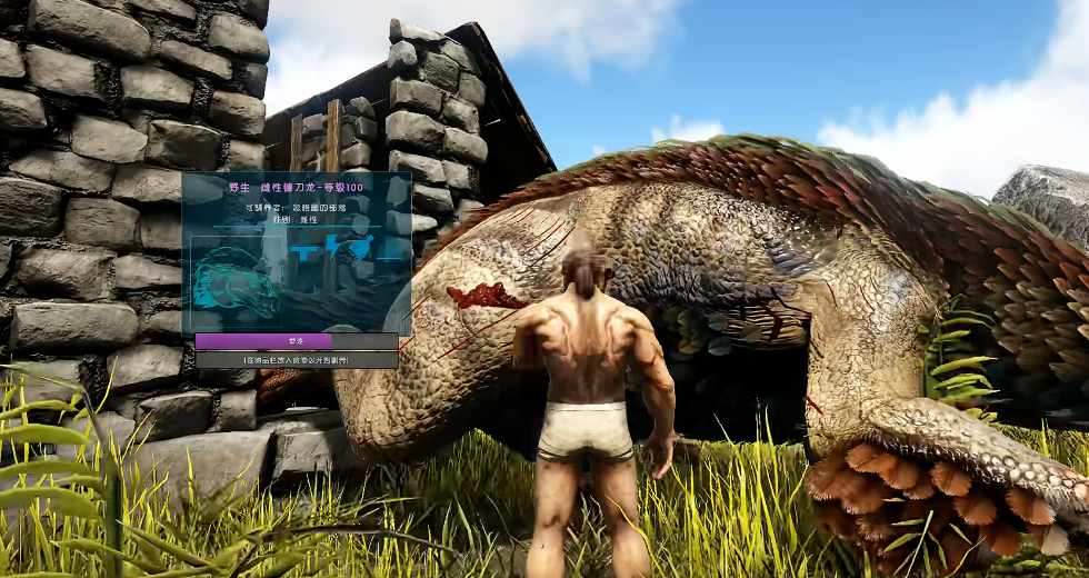 鞍具装备后,镰刀龙可发挥全能型功能:左键攻击可高效采集肉类、木材、兽皮等资源,右键专精纤维采集,C键则用于收割浆果。其战斗性能优于霸王龙,负重与耐力表现均衡,但需注意其暴躁性格,避免在敌对生物密集区域引发混战。若需长期保存镰刀龙,建议配备盐或风干箱延长食物保质期。