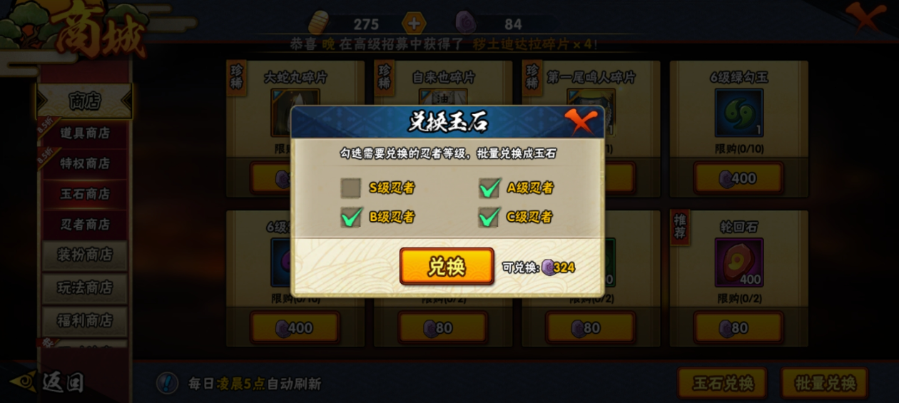 忍者碎片兑换是玉石的核心获取机制。当忍者达到五星后,多余碎片可在玉石商店兑换为玉石,C级、B级、A级碎片分别对应不同兑换比例。优先培养易获取的忍者能加速碎片溢出,从而提升玉石产量。需注意,玉石商店需拥有至少一名五星忍者才会开启,因此早期培养策略尤为重要。
