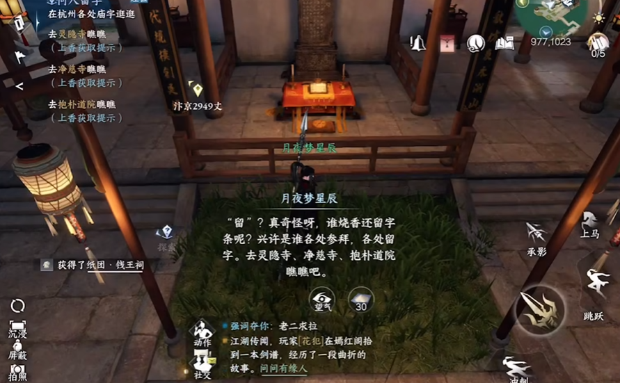 何人留字任务宝箱可不是随便就能找到的,得跟着线索一步步来。任务一开始,玩家需要溜达到杭州的钱王祠那儿,大概坐标(977,1023),看到个墓碑之类的位置,赶紧互动上香。这么一上香,哎,地上就冒出个纸团,捡起来一看,原来是要跑三个地方找线索。纸团上写的明明白白,接下来就得往灵隐寺、净慈寺和抱朴道院这三个地儿。