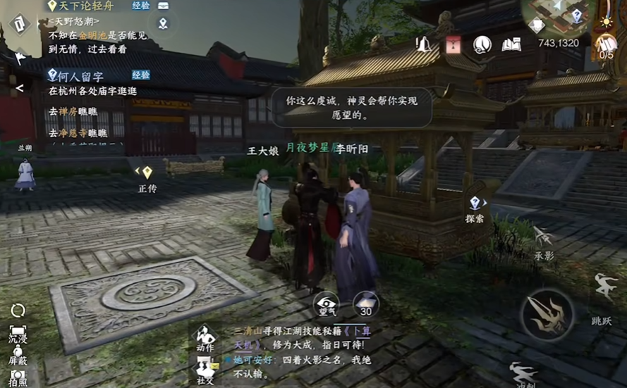 第一站是灵隐寺,坐标(745,1318)附近,到了后别忘了再用探索里的上香动作,触发剧情后,NPC会指点你去禅房瞅瞅。去禅房前,眼尖点,旁边草丛有萤火虫,抓一抓就能学到萤火微光这个技能,超实用的。进禅房后,黑咕隆咚的,立马用萤火微光照亮,接着就看那些蒲团了,得按顺序坐,比如先坐下,再左、右、上、下,顺序对了机关就开,宝箱到手。