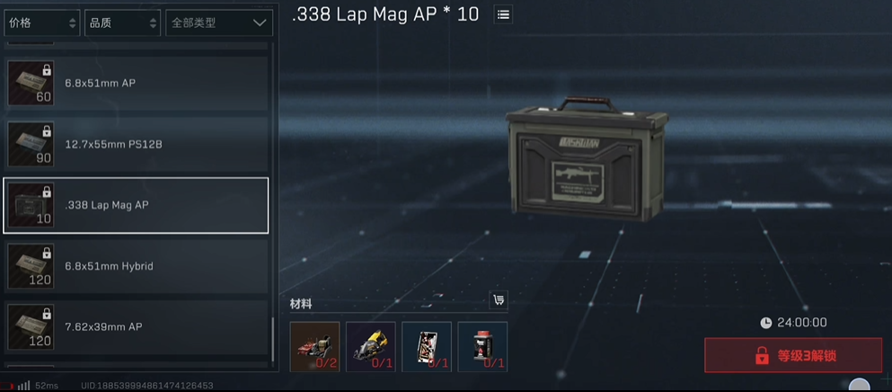 制造.338子弹需要消耗高级子弹生产零件作为核心材料,而这种材料非常稀有,获取方式具有严格限制。高级子弹生产零件只能通过在绝密难度的地图中开启武器箱获得,游戏中没有其他任何途径可以获取这种资源。这意味着玩家必须挑战高难度的绝密地图,成功找到并打开武器箱,才有机会收集到所需材料,从而增加了AWM子弹的稀有性和制作成本。